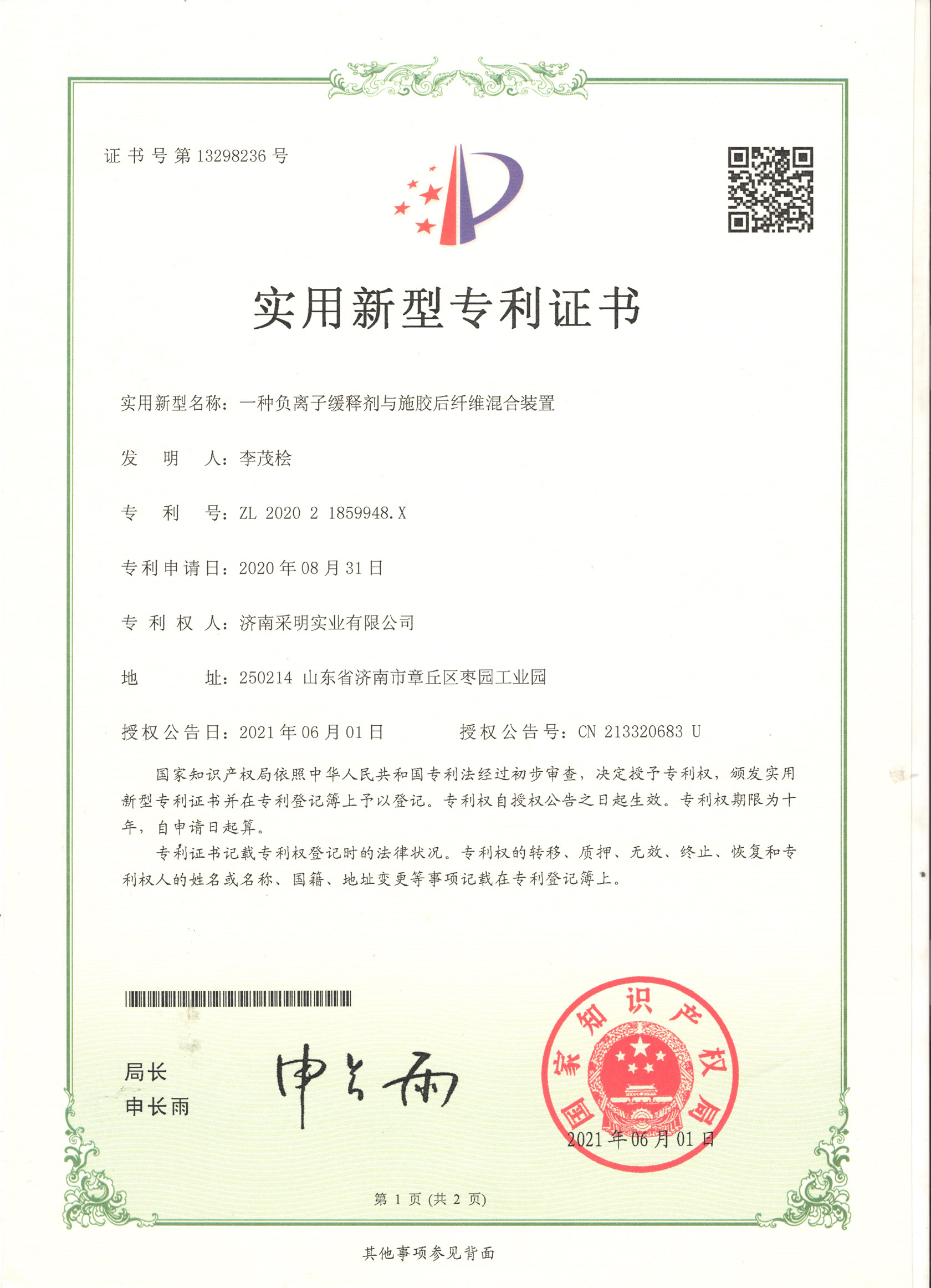 負(fù)離子緩釋劑與施膠后纖維混合裝置證書(shū)